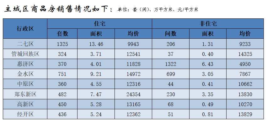 鄭州全市商品房銷售11017套(間),銷售面積122.74萬(wàn)平方米,銷售均價(jià)10061元/平方米;其中商品住宅銷售7767套,銷售面積92.15萬(wàn)平方米,銷售均價(jià)11109元/平方米。非住宅銷售3250套(間),非住宅銷售面積30.59萬(wàn)平方米,非住宅銷售均價(jià)為6904元/平方米。