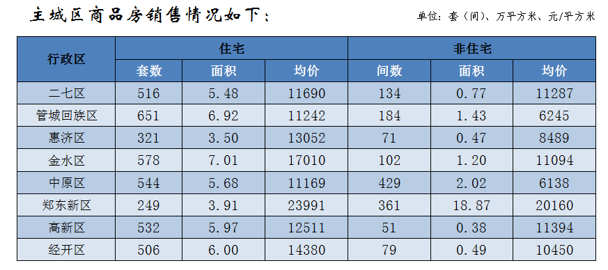 鄭州全市商品房銷售9680套(間),銷售面積122.42萬平方米,銷售均價11775元/平方米;其中商品住宅銷售7777套,銷售面積90.38萬平方米,銷售均價10684元/平方米。非住宅銷售1903套(間),非住宅銷售面積32.04萬平方米,非住宅銷售均價為14852元/平方米。