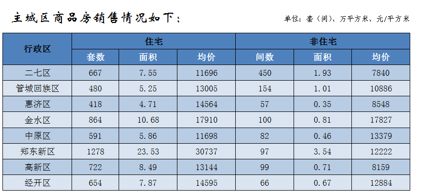 鄭州全市商品房銷售11428套(間),銷售面積144.9萬(wàn)平方米,銷售均價(jià)13830元/平方米;其中商品住宅銷售9847套,銷售面積124.34萬(wàn)平方米,銷售均價(jià)14479元/平方米。非住宅銷售1581套(間),非住宅銷售面積20.56萬(wàn)平方米,非住宅銷售均價(jià)為9906元/平方米。