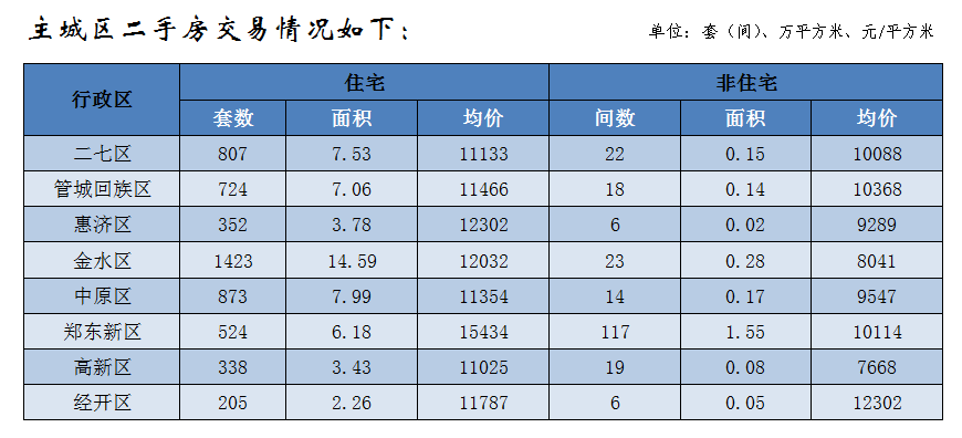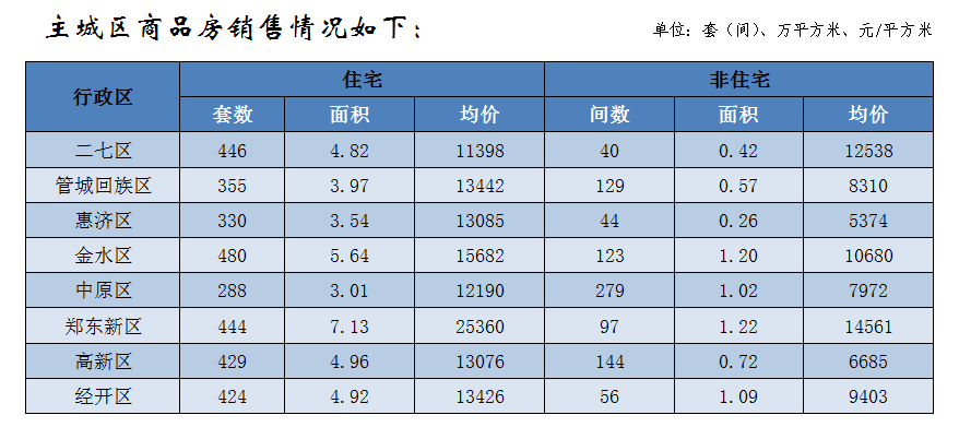 鄭州全市商品房銷售7238套(間),銷售面積82.3萬平方米,銷售均價11605元/平方米;其中商品住宅銷售5919套,銷售面積71.6萬平方米,銷售均價11992元/平方米。非住宅銷售1319套(間),非住宅銷售面積10.7萬平方米,非住宅銷售均價為9013元/平方米。