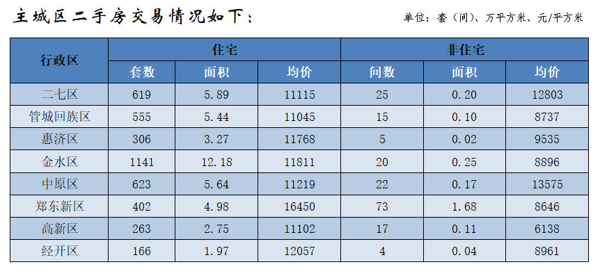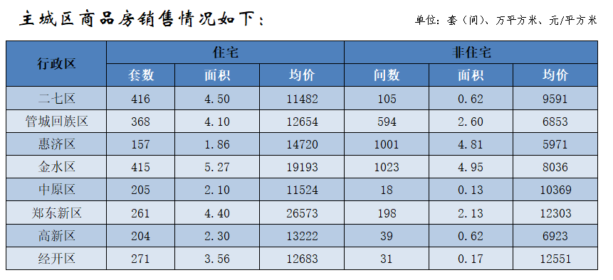 鄭州全市商品房銷售8210套(間),銷售面積80.95萬平方米,銷售均價10907元/平方米;其中商品住宅銷售4920套,銷售面積62.18萬平方米,銷售均價11879元/平方米。非住宅銷售3290套(間),非住宅銷售面積18.77萬平方米,非住宅銷售均價為7688元/平方米。