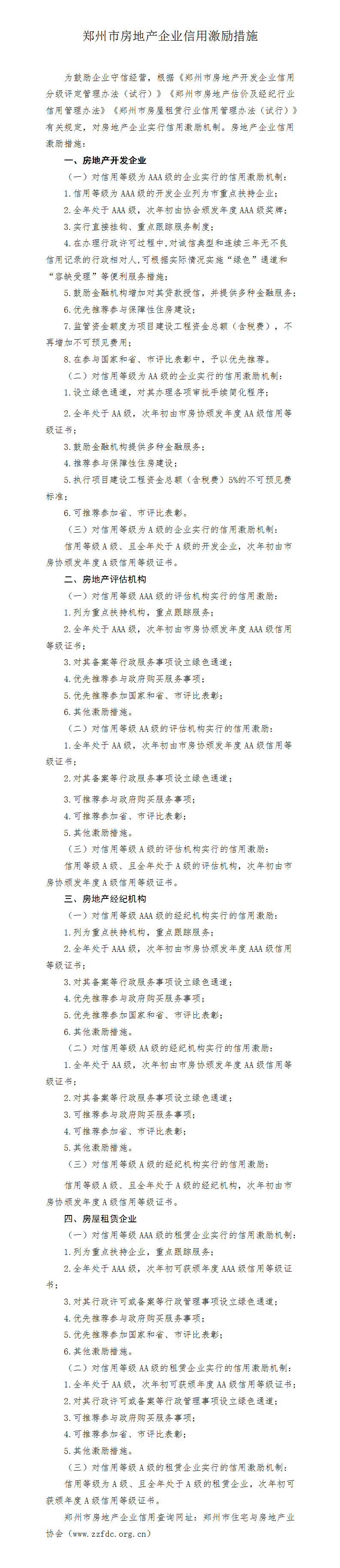鄭州市房地產(chǎn)企業(yè)信用激勵措施