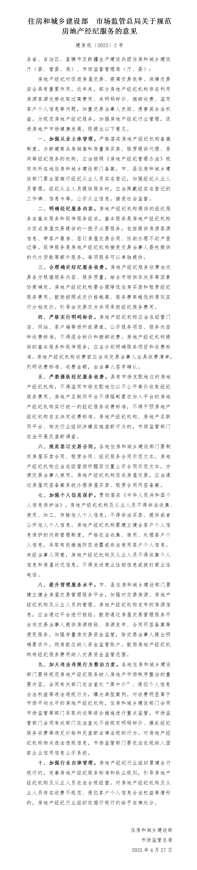 住房和城鄉(xiāng)建設(shè)部、市場(chǎng)監(jiān)管總局關(guān)于規(guī)范房地產(chǎn)經(jīng)紀(jì)服務(wù)的意見