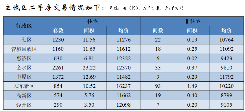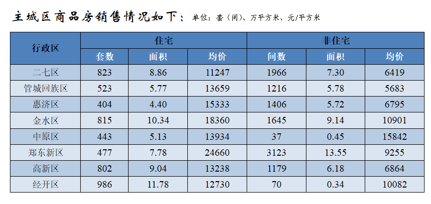 鄭州全市商品房銷售19651套(間),銷售面積160.9萬平方米,銷售均價10748元/平方米;其中商品住宅銷售8519套,銷售面積103.12萬平方米,銷售均價12451元/平方米。非住宅銷售11132套(間),非住宅銷售面積57.78萬平方米,非住宅銷售均價為7708元/平方米。