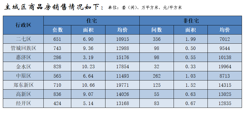 鄭州全市商品房銷售13710套(間),銷售面積163.47萬平方米,銷售均價(jià)9911元/平方米;其中商品住宅銷售12207套,銷售面積143.88萬平方米,銷售均價(jià)10258元/平方米。非住宅銷售1503套(間),非住宅銷售面積19.59萬平方米,非住宅銷售均價(jià)為7357元/平方米。
