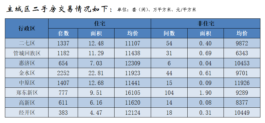 鄭州全市二手房共成交11544套(間),成交面積122.33萬平方米,成交均價(jià)10468元/平方米;其中住宅二手房共成交11213套,成交面積117.23萬平方米,成交均價(jià)10555元/ 平方米。(備注:二手房均價(jià)是以評(píng)估指導(dǎo)價(jià)為計(jì)算依據(jù))