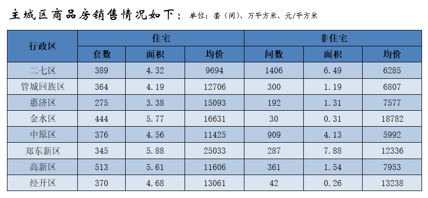 鄭州全市商品房銷售10367套(間),銷售面積104.9萬平方米,銷售均價10110元/平方米;其中商品住宅銷售6232套,銷售面積76.07萬平方米,銷售均價10883元/平方米。非住宅銷售4135套(間),非住宅銷售面積28.83萬平方米,非住宅銷售均價為8068元/平方米。