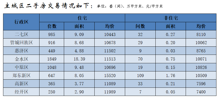 鄭州全市二手房共成交9056套(間),成交面積94.79萬平方米,成交均價9953元/平方米;其中住宅二手房共成交8675套,成交面積90.83萬平方米,成交均價9974元/平方米。(備注:二手房均價是以評估指導價為計算依據)